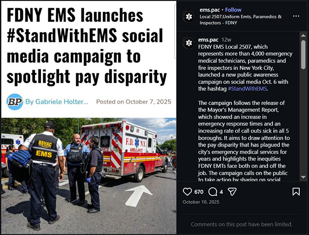 In October, FDNY EMS Local 2507 launched a new public awareness campaign on social media with the hashtag #StandWithEMS in response to the DMMR.