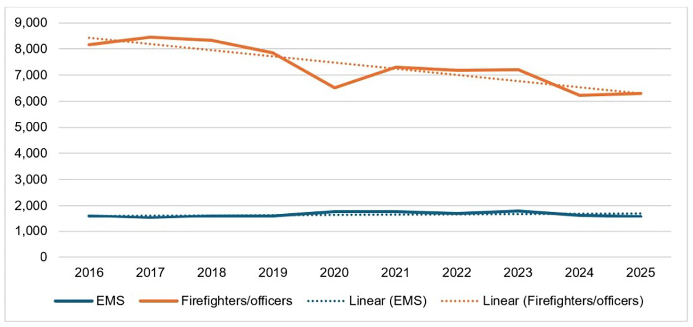 The data indicated the number of service-related injuries has decreased for firefighters but remained flat for EMS professionals, and collisions have decreased for fire apparatus but increased for ambulances.