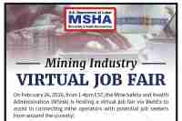 February 20, 2026 · In support of the President’s Cost of Living Initiative, the Mine Safety & Health Administration is hosting a virtual Mining Industry Job Fair Thursday, Feb. 26, 2026 from 1-4 p.m. EST.